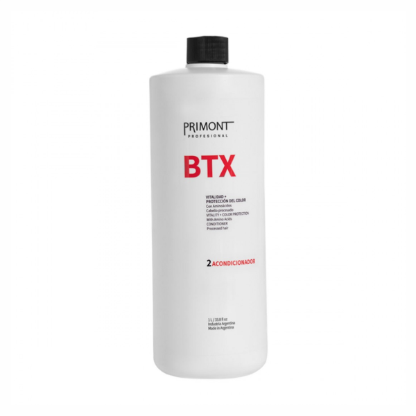 El Acondicionador BTX de Primont está formulado para complementar los tratamientos de alisado o recuperación capilar. Enriquecido con activos regeneradores, ayuda a reparar la fibra capilar, controlar el frizz y mejorar la textura del cabello, dejándolo visiblemente más liso, suave y brillante.